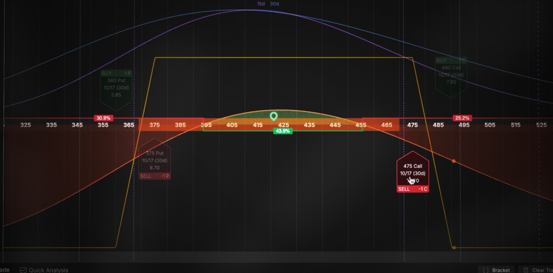 View real-time portfolio stress tests on your queued trades and open positions using our Risk Analysis tool. This advanced risk management tool helps you see the potential effects of price moves, implied volatility shocks, and expiring positions on your portfolio.